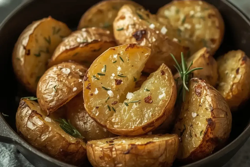 Cria uma Camada de Amido: Durante a fervura, a superfície da batata libera amido e fica levemente “esfarelada”. Depois de escorrer a água, você chacoalha as batatas na panela, e essa superfície úmida e amilácea se torna uma camada texturizada. É essa camada que, em contato com o azeite e o calor alto do forno, vai se transformar em uma casca incrivelmente crocante e cheia de reentrâncias.
