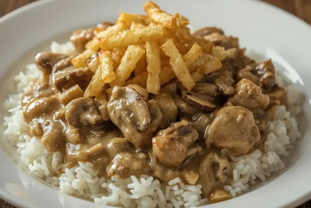 7. Sirva imediatamente sobre arroz branco e finalize com uma generosa porção de batata palha por cima.