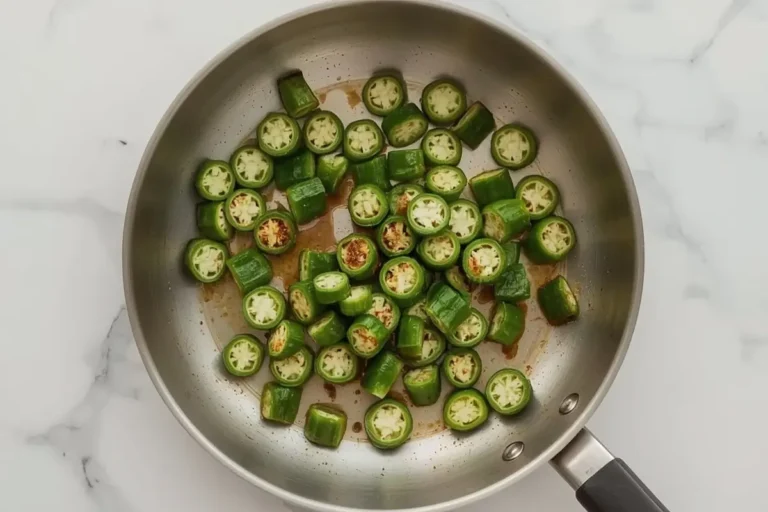 Sele o Quiabo: Em uma frigideira, aqueça um fio de azeite em fogo médio. Adicione o quiabo (sem o excesso de líquido da marinada) e frite-o, mexendo de vez em quando, por cerca de 5 a 7 minutos. Você vai notar que ele não soltará baba. Ele deve ficar “al dente” e com uma cor verde viva. Retire da frigideira e reserve.