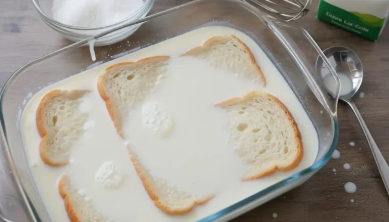 2. Embeba o Pão: Coloque as fatias de pão em um refratário. Despeje o leite por cima. Deixe de molho por 10 a 15 minutos, virando na metade do tempo, até o pão absorver bem o líquido.