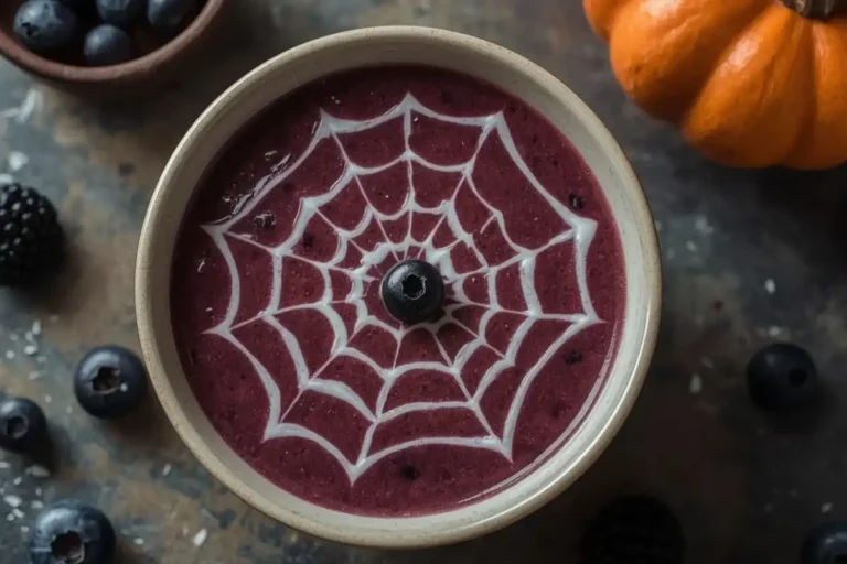 A Base: Você precisa de uma base lisa e de cor contrastante para a teia se destacar. Pode ser um purê de frutas escuras (como açaí ou frutas vermelhas), uma camada de geleia, ou simplesmente frutas escuras picadas no fundo de uma tigela (mirtilos, amoras, uvas pretas).