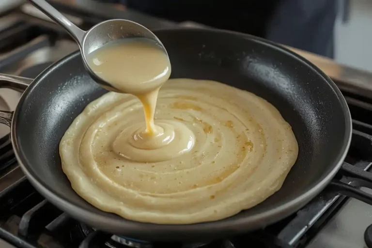 Frite (Frigideira Quente!): Aqueça uma frigideira antiaderente média em fogo médio. Unte levemente com manteiga. Despeje uma concha pequena de massa e espalhe rapidamente, girando a frigideira, para formar uma panqueca fina e uniforme.