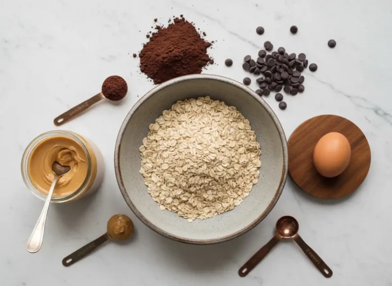 2. Em uma tigela, misture a aveia, o cacau, o fermento e o sal.