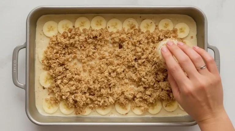 7. Asse: Leve ao forno pré-aquecido por cerca de 40 a 50 minutos, ou até que um palito inserido no centro da massa (não na banana) saia limpo e a farofa esteja dourada e crocante.