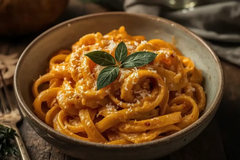 A Água do Cozimento (O Emulsificante Secreto): Nunca jogue fora toda a água do cozimento do macarrão! Ela é rica em amido e funciona como o emulsificante perfeito para unir o molho de abóbora à massa, garantindo que cada fio de macarrão fique perfeitamente coberto por um molho cremoso e não aguado.