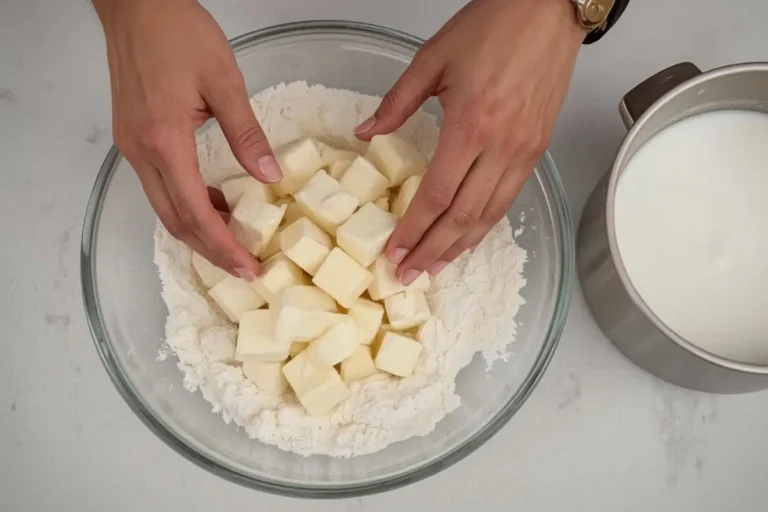 Prepare a Massa: Em uma tigela grande, misture a farinha de trigo e o sal. Adicione os cubos de manteiga gelada. Com a ponta dos dedos, “belisque” a manteiga na farinha até formar uma farofa grossa, com pedacinhos de manteiga ainda visíveis.