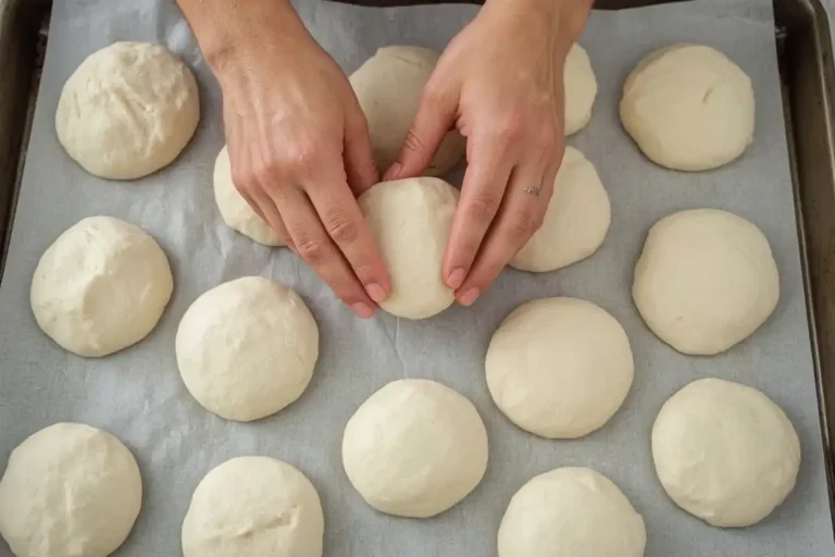 Modele: Divida a massa em 8 a 10 porções. Modele cada porção em uma bola e achate levemente, formando discos. Coloque em uma assadeira forrada com papel manteiga, deixando espaço entre eles. Cubra e deixe descansar por mais 30 minutos.