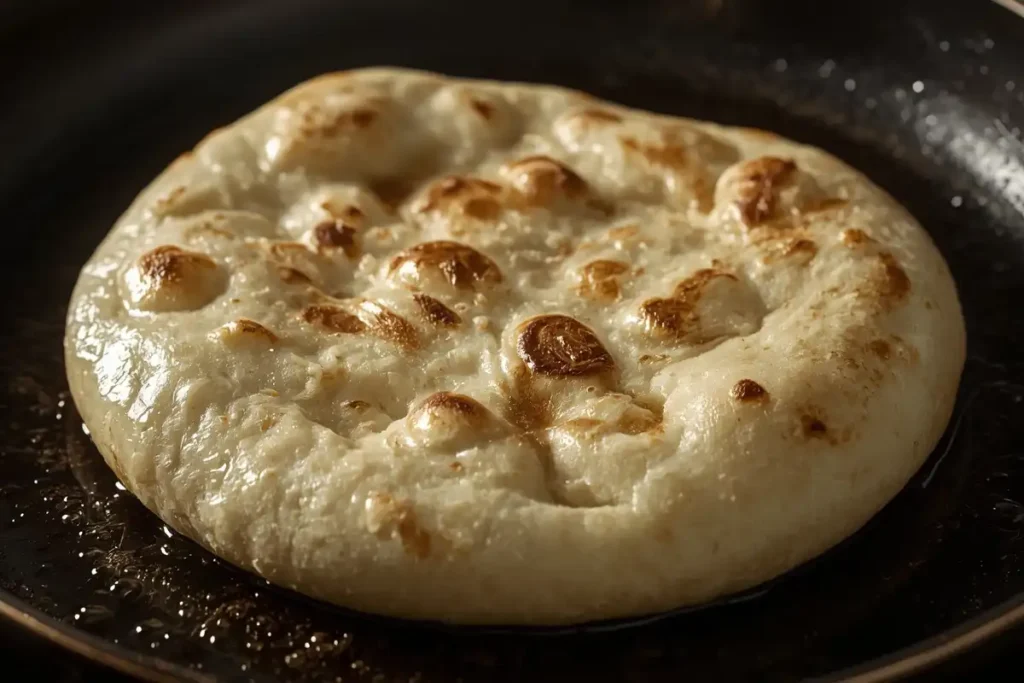 Asse (Temperatura Alta – O Segredo!): Aqueça uma frigideira antiaderente ou chapa em fogo bem alto. Quando estiver muito quente, coloque um disco de massa. Asse por cerca de 1 a 2 minutos de cada lado. O pão deve inflar formando uma bolsa. Se não inflar, a frigideira não está quente o suficiente.