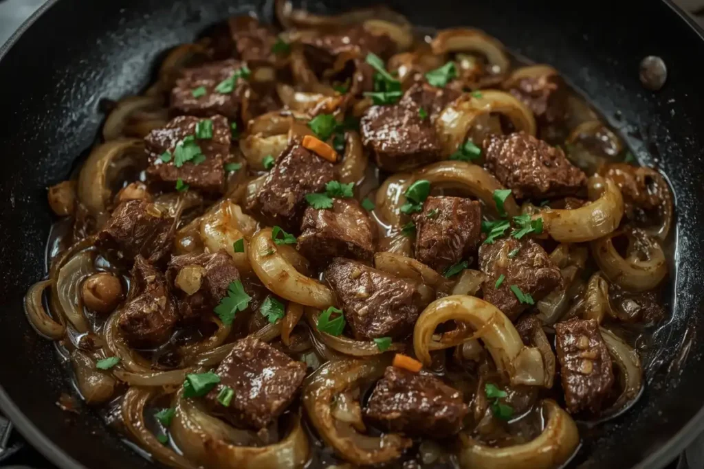 Na mesma frigideira, refogue as cebolas até ficarem macias e caramelizadas.