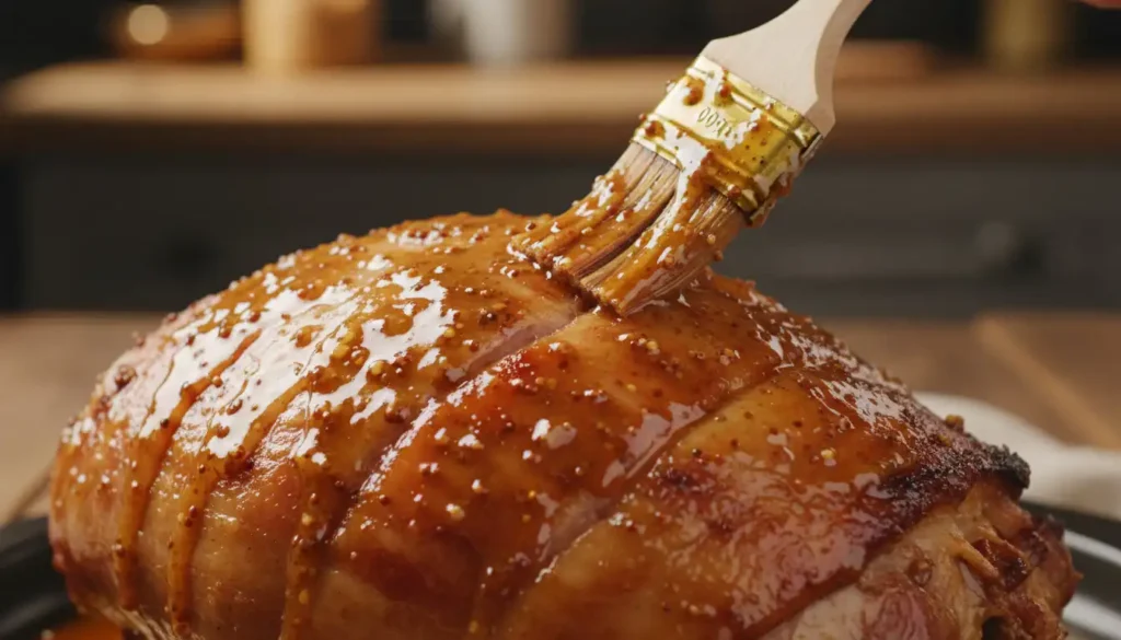4. Glaze e Finalização: Misture mel, mostarda e molho de soja. Retire o papel alumínio, aumente a temperatura para 220°C. Pincele o pernil com o glaze. Asse por mais 30 a 40 minutos, pincelando a cada 10 minutos, até ficar dourado e caramelizado.