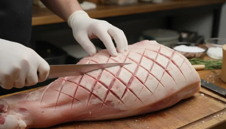 1. Prepare o Pernil: Faça cortes profundos (cerca de 3cm) em toda a superfície do pernil, formando um padrão de losangos. Isso ajuda a marinada a penetrar.