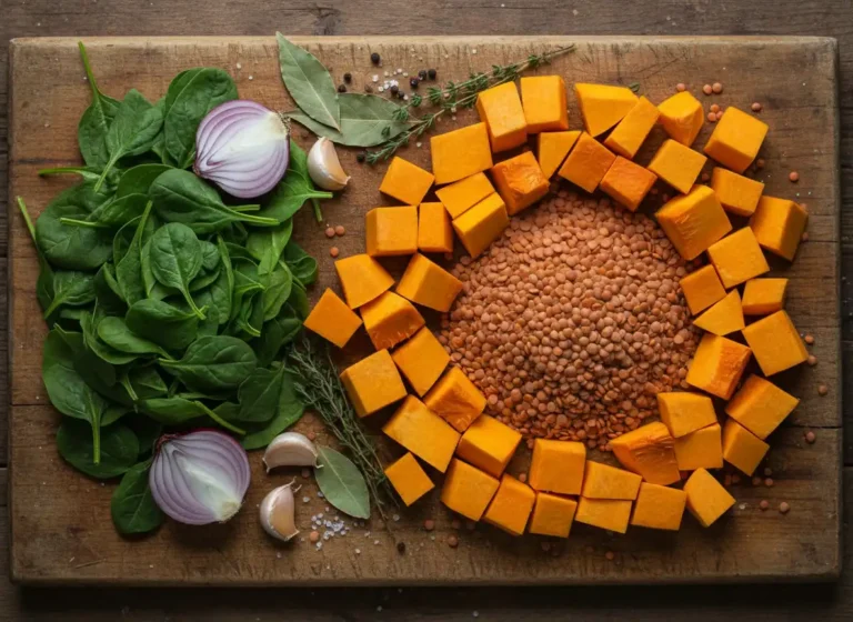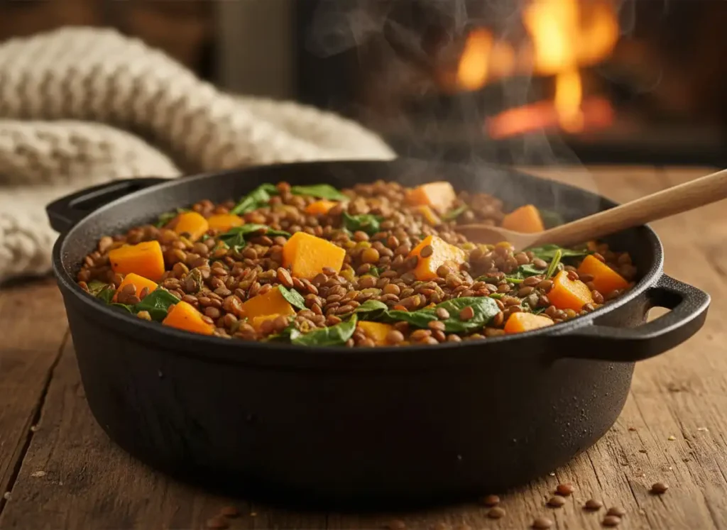 Essa receita é um verdadeiro abraço nutritivo em forma de comida. A lentilha é rica em proteínas vegetais, fibras e ferro, ajudando na saciedade e na saúde do sangue. A abóbora fornece betacaroteno, vitaminas e fibras que contribuem para a imunidade e o equilíbrio do organismo. O espinafre complementa com minerais essenciais e antioxidantes poderosos, tornando esse prato extremamente completo do ponto de vista nutricional.