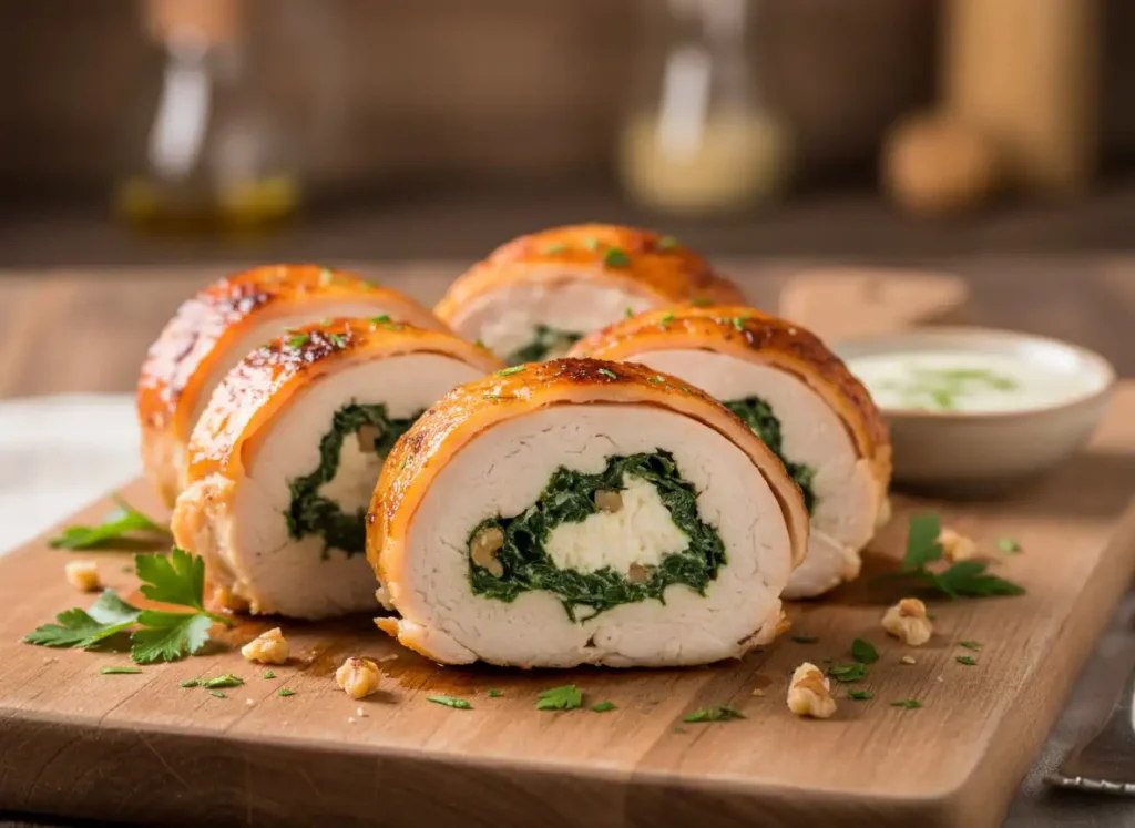 Este rolê de frango com recheio de espinafre, ricota e nozes é a combinação perfeita de leveza, sofisticação e nutrição. Macio, suculento e cheio de textura, ele transforma qualquer refeição em um momento especial, provando que é possível unir sabor, saúde e apresentação impecável em um único prato. Que tal incluí-lo na sua próxima celebração ou jantar especial?