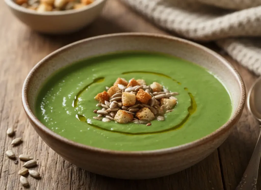 A sopa cremosa de ervilha com alho-poró e croutons de semente é a definição perfeita de conforto saudável. Cremosa, nutritiva e cheia de textura, ela alimenta o corpo, aquece a alma e prova que simplicidade e saúde podem andar juntas em uma única colherada.