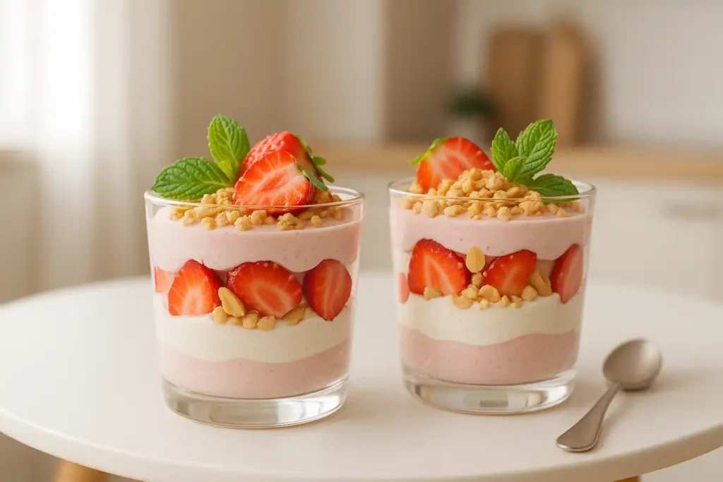 Em cada taça, faça camadas: creme proteico, morangos picados, mais creme e finalize com o crumble crocante por cima.